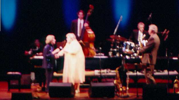 Rosemary then asked Marian McPartland to come back and join her on stage. After greeting one another, Marian told Rosemary that recently someone had written to her and told her that their favorite rendition of "Don't Fence Me In" was Rosemary's. A flattered Rosemary humbly responded "how nice." (Rosemary performed "Don't Fence Me In" on Marian McPartland's NPR show, PIANO JAZZ with Rosemary Clooney recorded on October 14, 1991.)