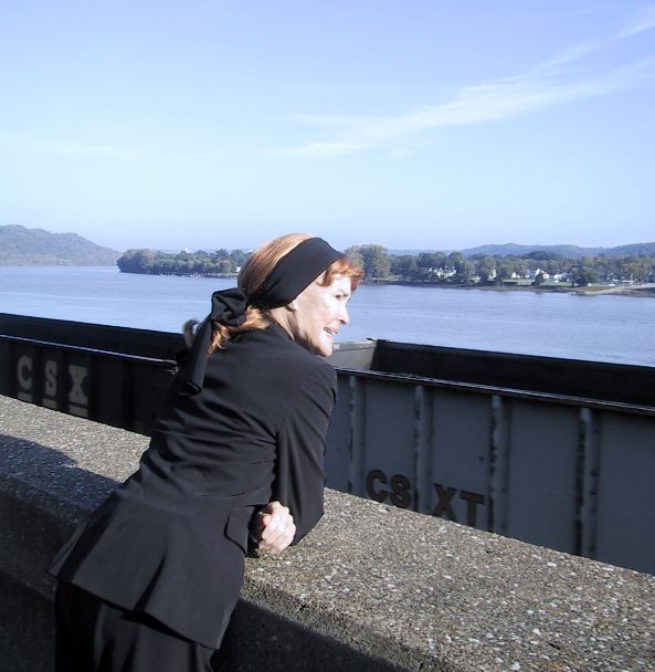 Following are a few pictures of Mrs. Crosby taken on Sunday after all the festival activities were over. She enjoyed a lovely breakfast at the French Quarter Inn Here she is on the balcony, looking out at the river and watching as a train goes by.